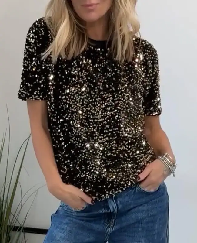 Women's Round Neck Sequined Casual T-shirt