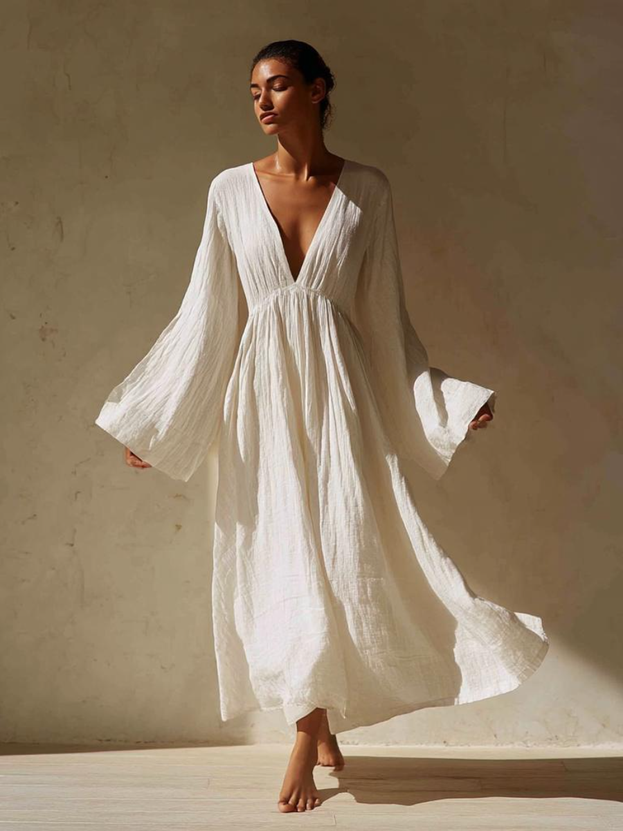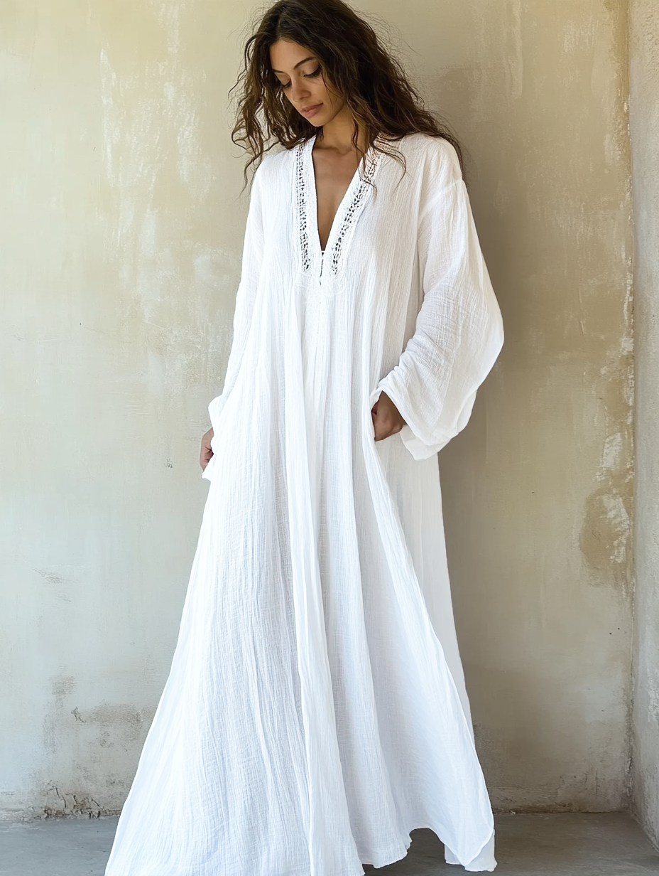 Women's White Art Linen V Neck Robe