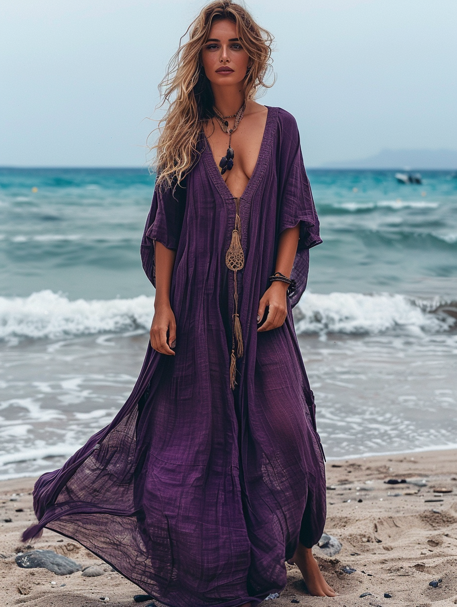 Caftan Kimono Solid Purple Color Beach V-Neck Kaftan Dress