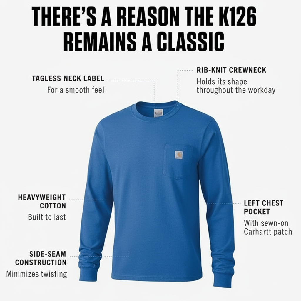 Our pocket t-shirt debuted in 1992, and its rugged cotton design and clean looks made it a fast favorite among the hard-working folks who pulled it on. Though decades and trends have come and gone, there's a reason the K126 remains a classic. This men's t-shirt is made with heavyweight cotton built to handle tough days on the job. It has an loose fit that gives you room to move and a soft feel that only gets better with time.