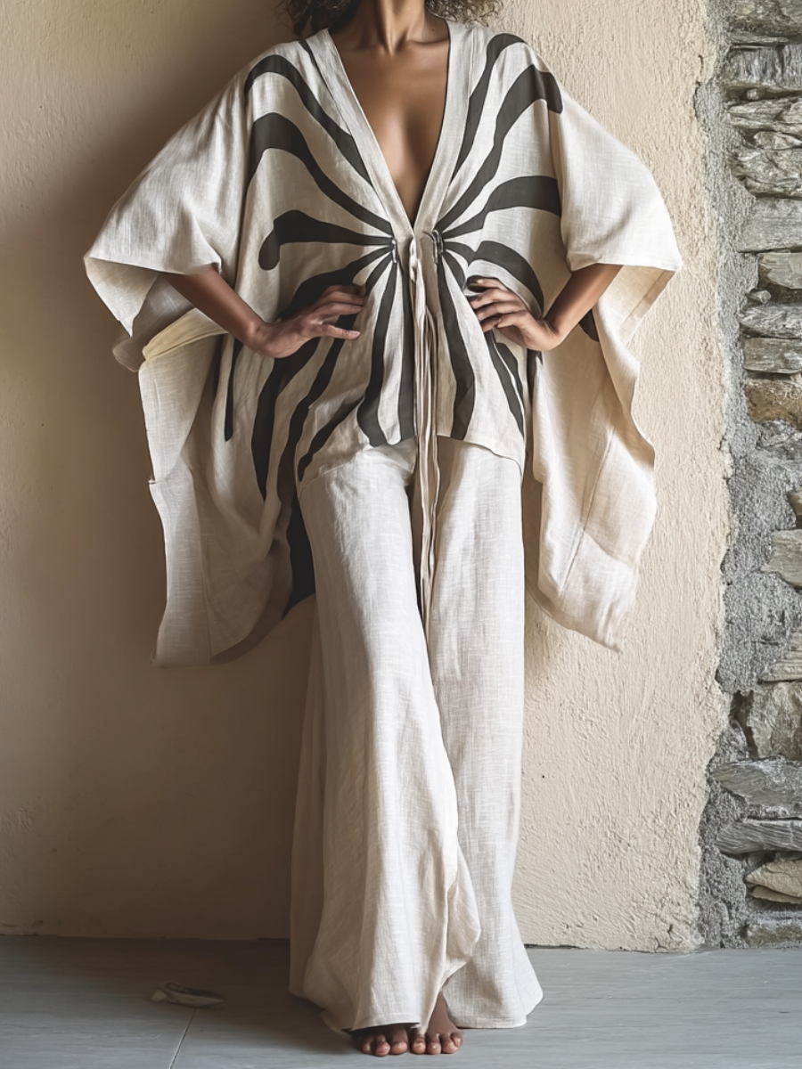 Kimono Ink Wash Linen Tie-strap Top and trousers Two Piece Set