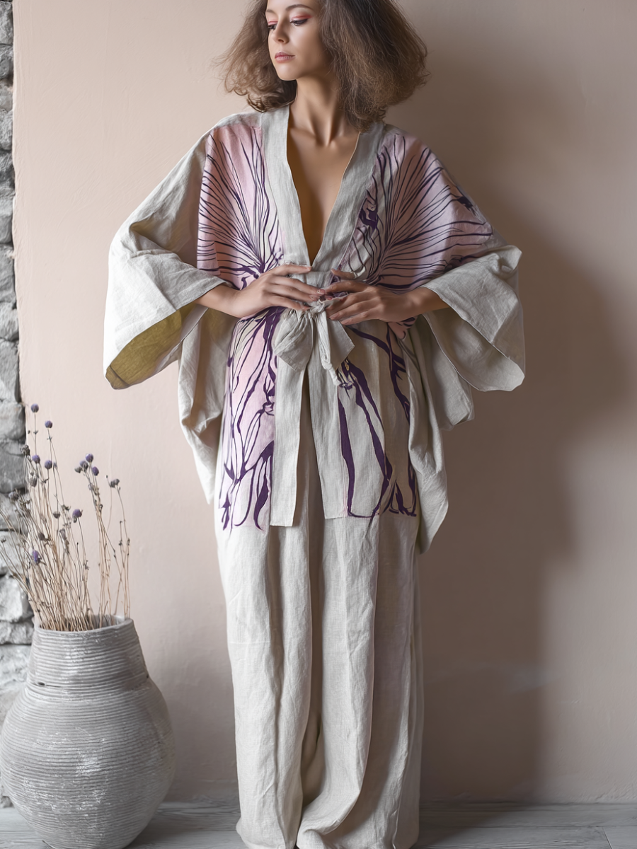Kimono Pale Moon Linen Tie-strap Top and trousers Two Piece Set