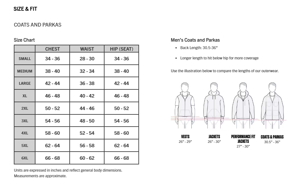 Note: If your measurement falls between sizes, buy the larger size. Units are expressed in inches and reflect general body dimensions. Measurements are approximate.