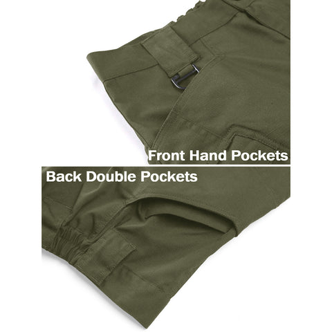 - 9 Pockets: with 2 front hand pockets, 3 back hand pockets, 2 zipper pockets & 2 cargo pockets with hook and loop closures at the thigh (deep enough for holding knife and cellphone).