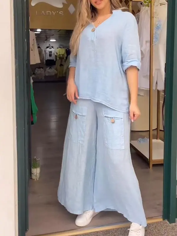 Women's Casual V-neck Solid Color Cotton and Linen Two-piece Suit