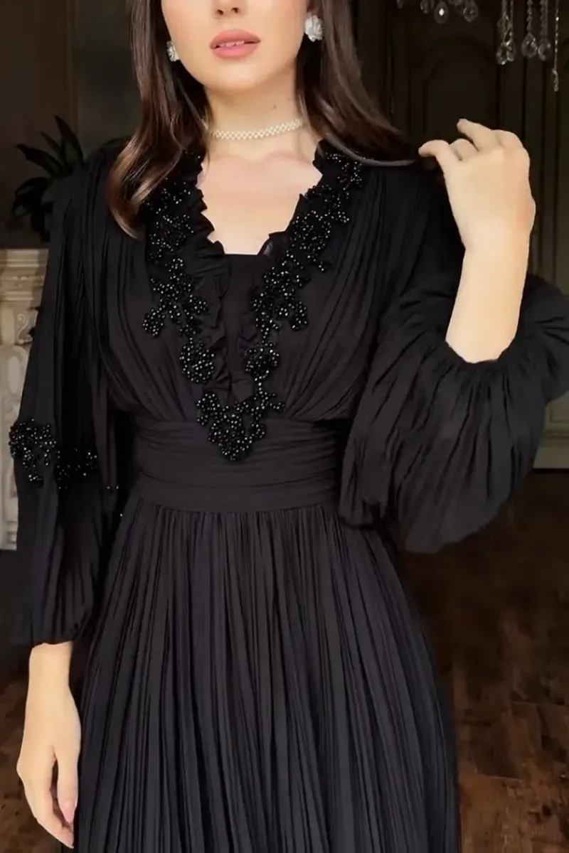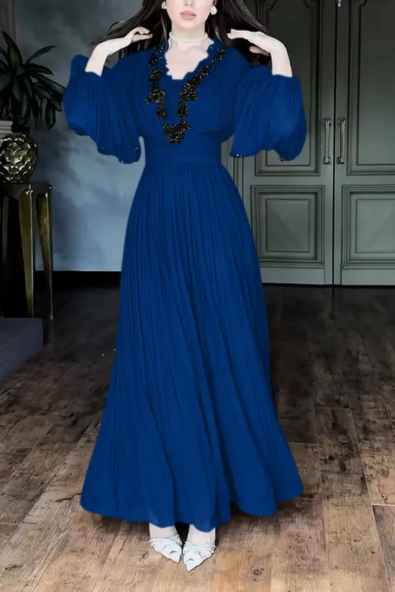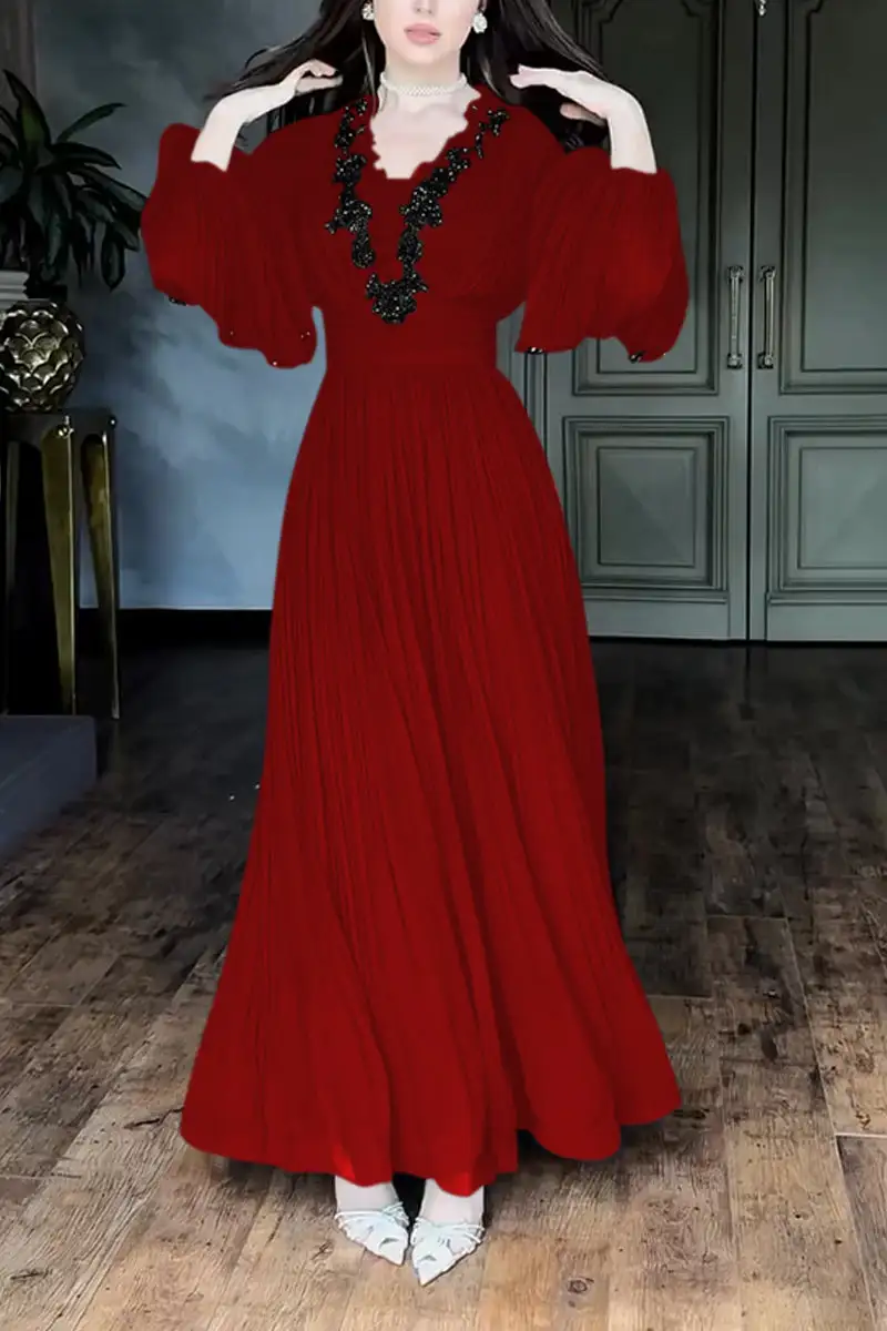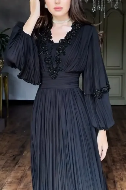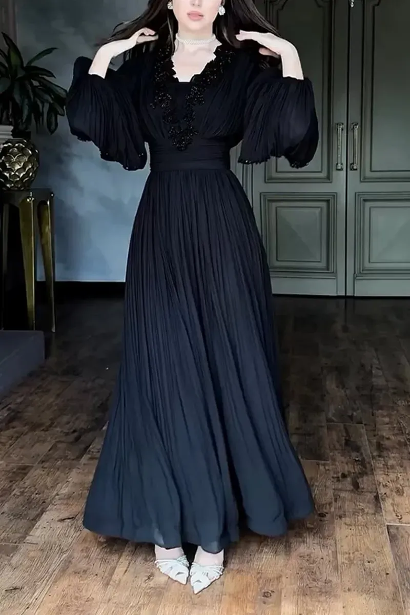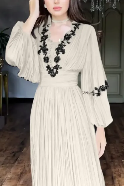 Women's Elegant V-neck Lace-embellished Puff Sleeve Dress