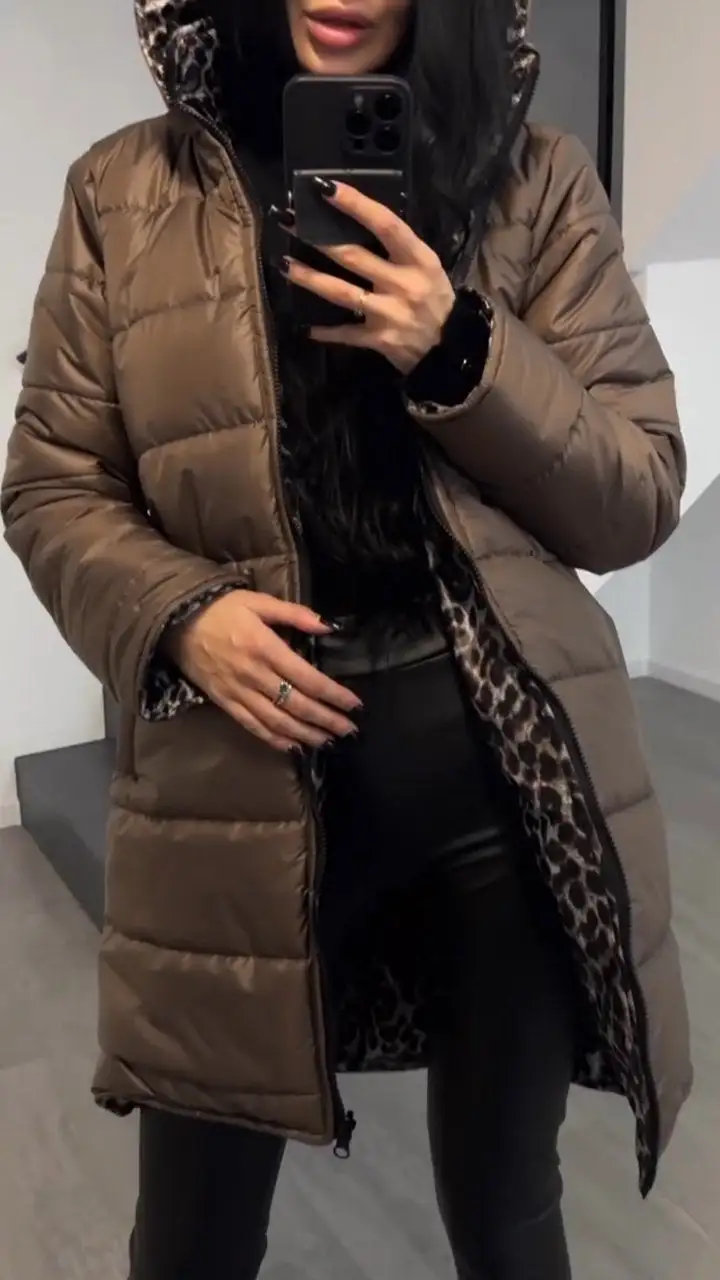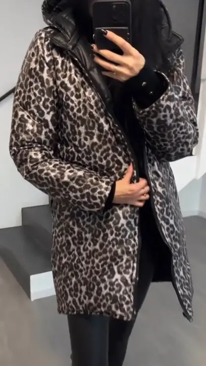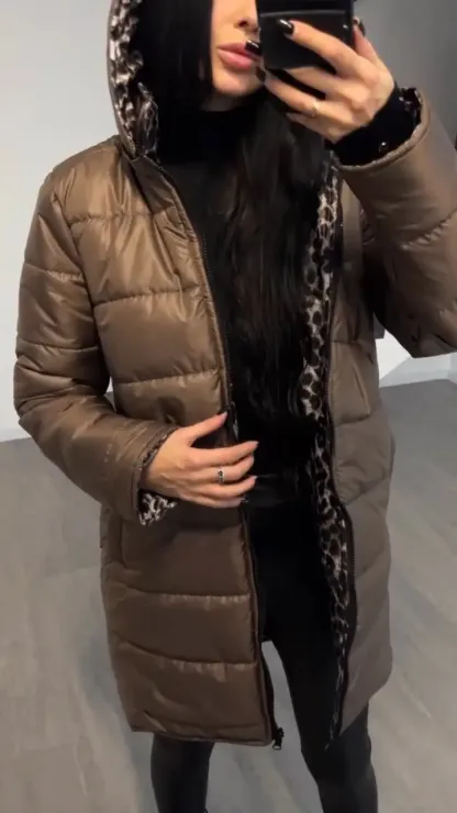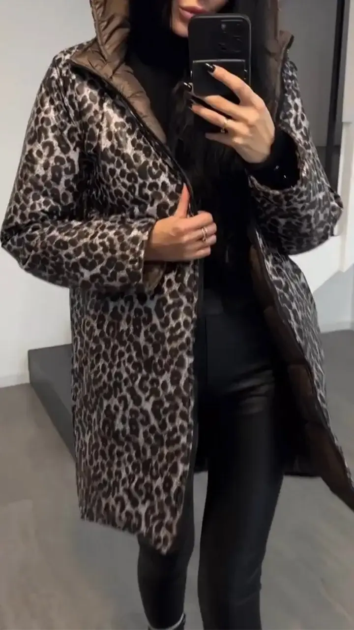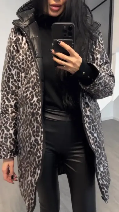 Women's Hooded Leopard + Solid Color Double-Sided Cotton Coat