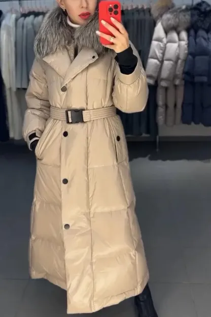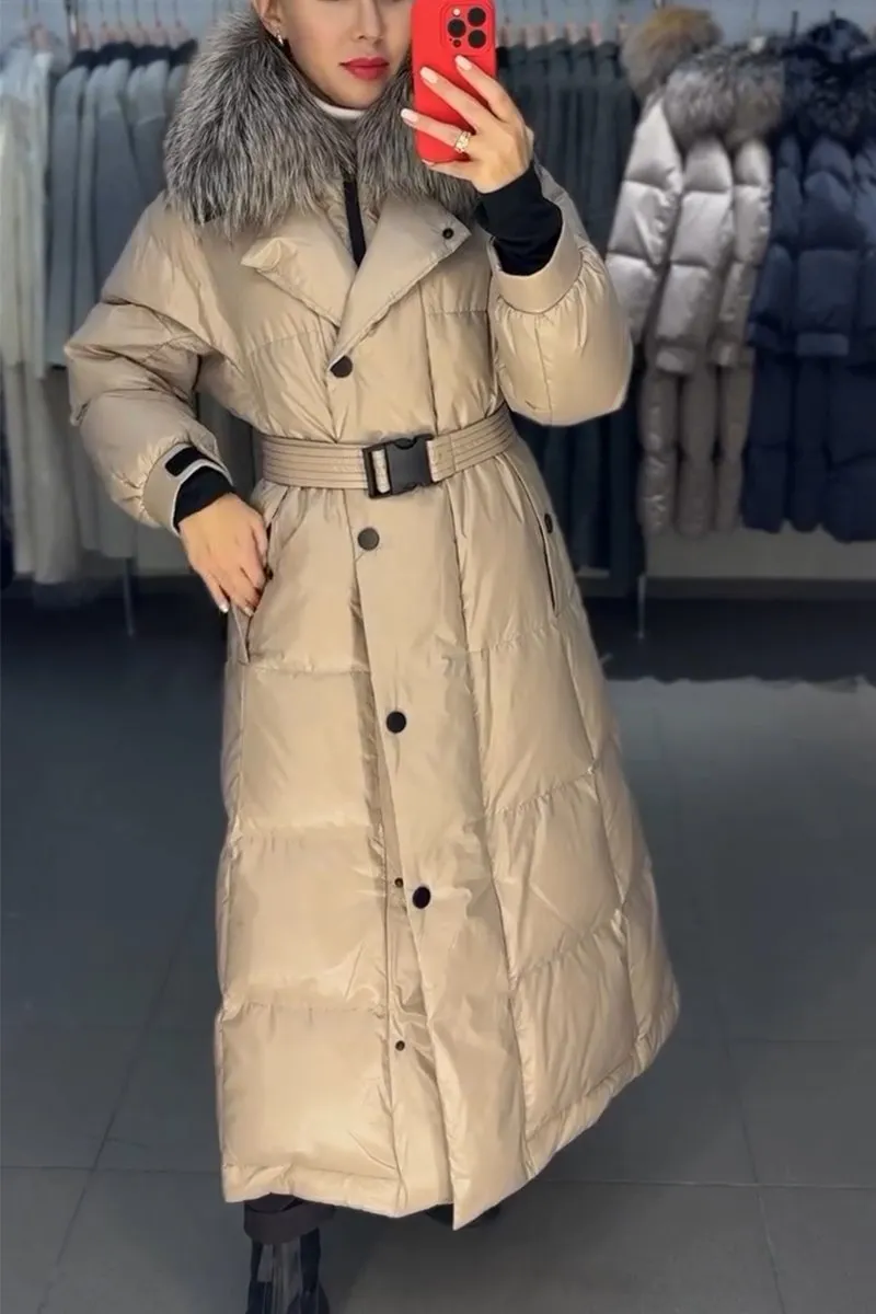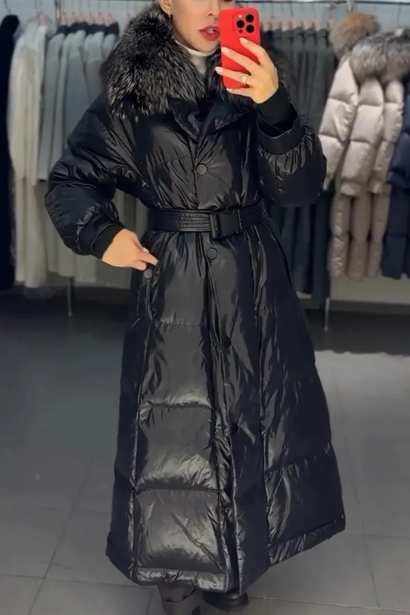 Women's Retro Elegant Hooded Fur Collar Belt Pocket Button Long Cotton Coat