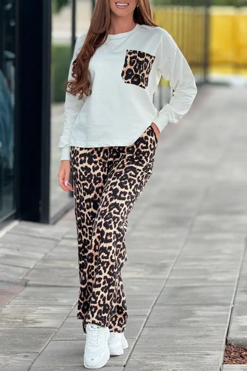 Women's Round Neck Long Sleeve Leopard Print Patchwork Suit