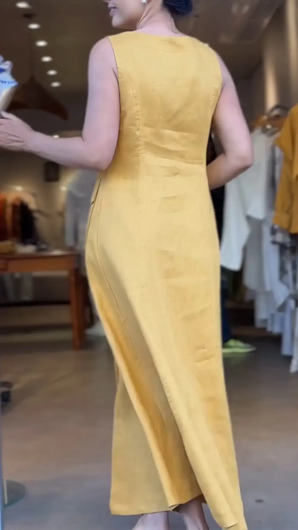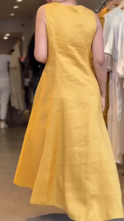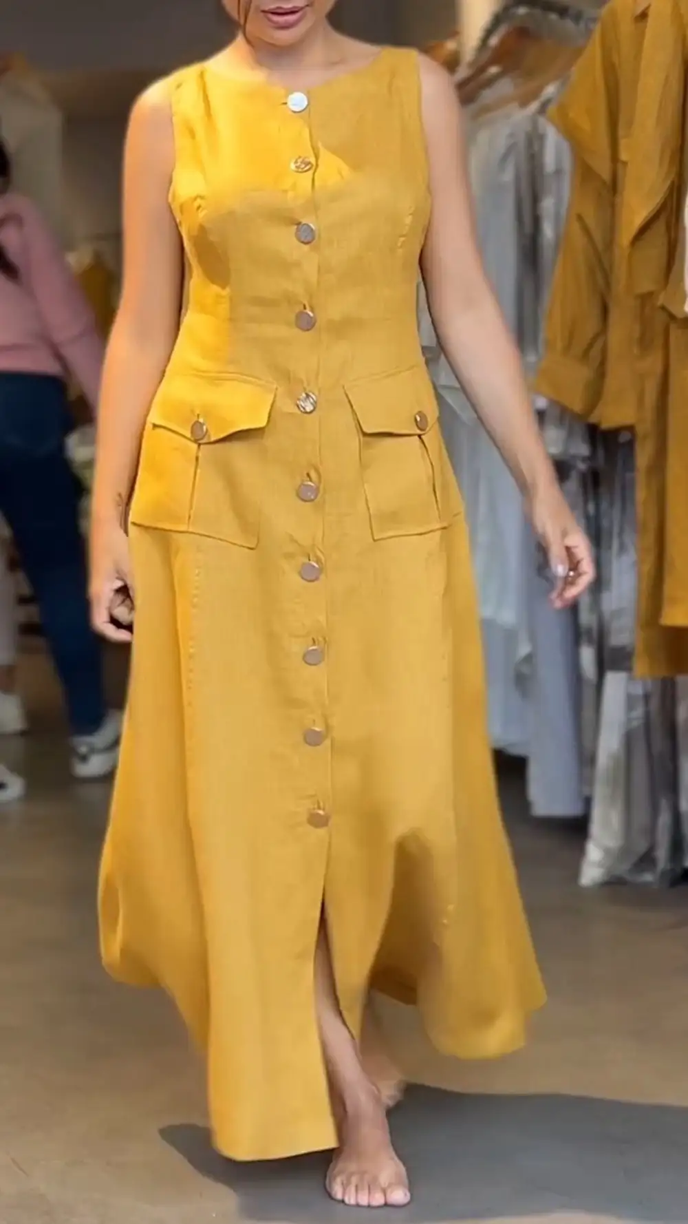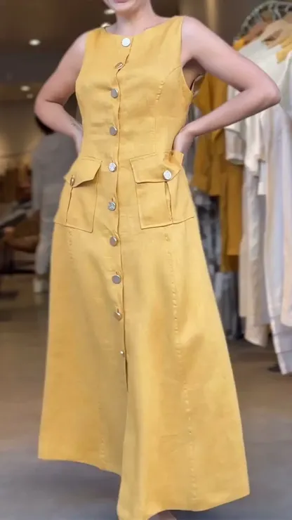 Women's Round Neck Sleeveless Casual Button Double Pocket Design Dress
