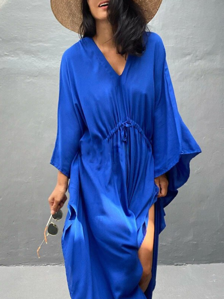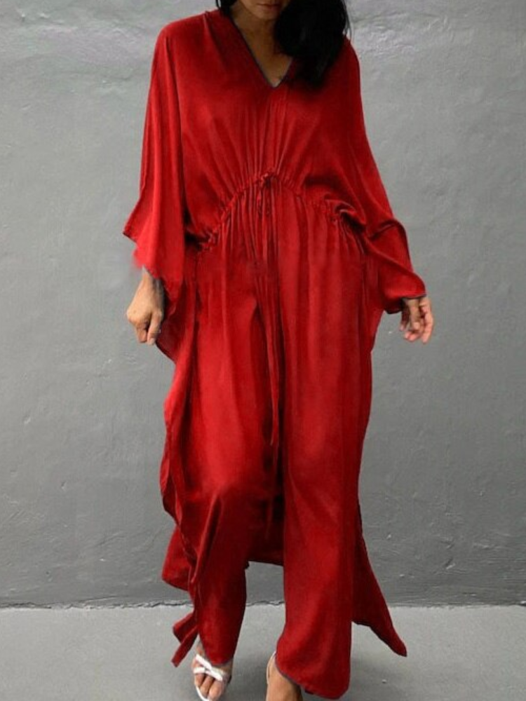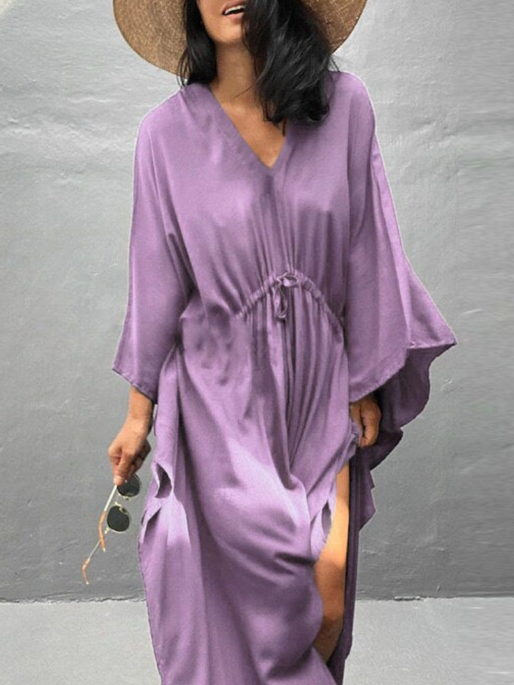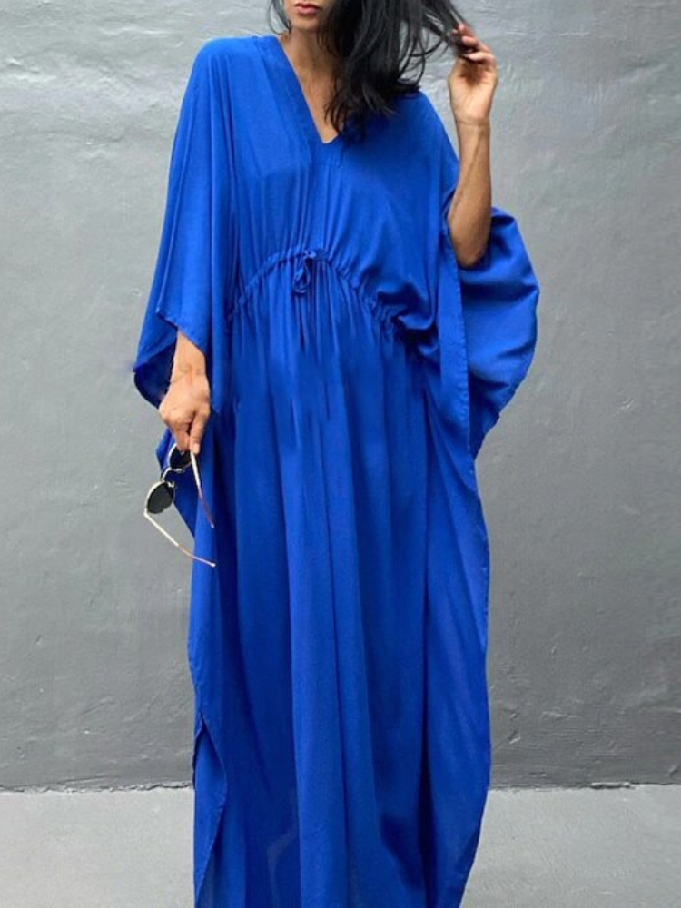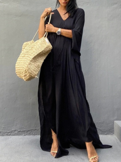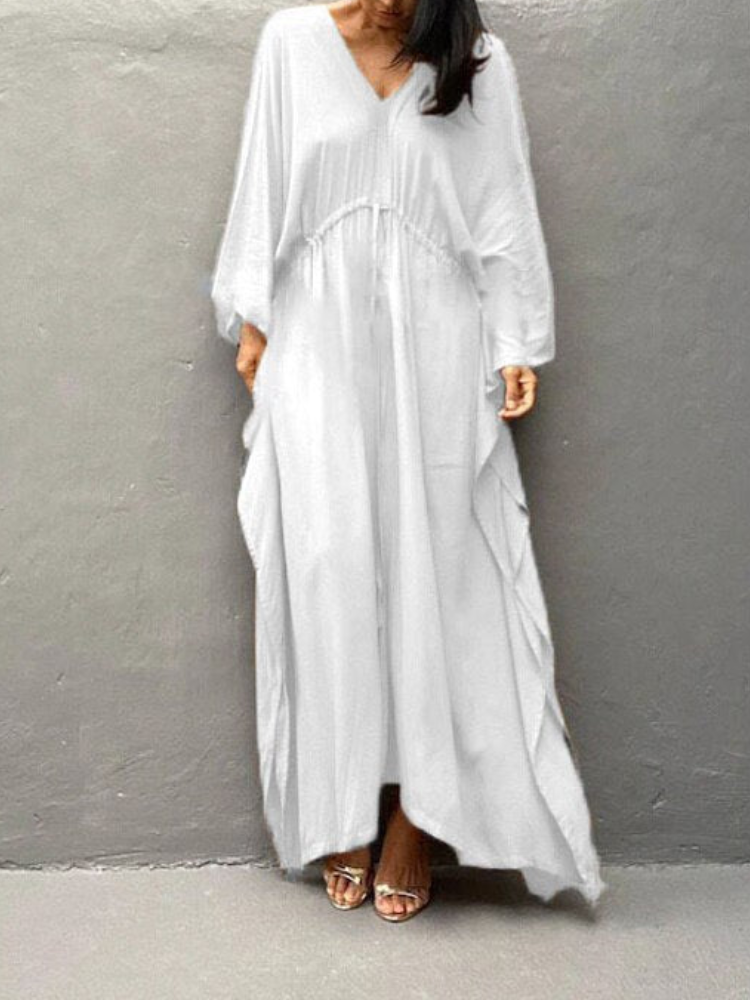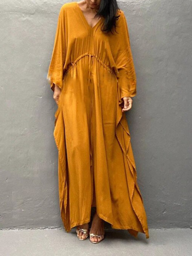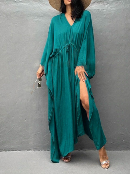 Womens V Neck Long Sleeve Solid Pattern Kaftan Maxidress