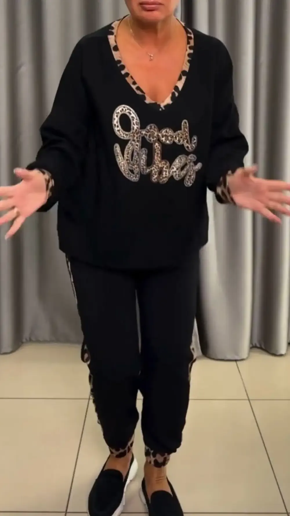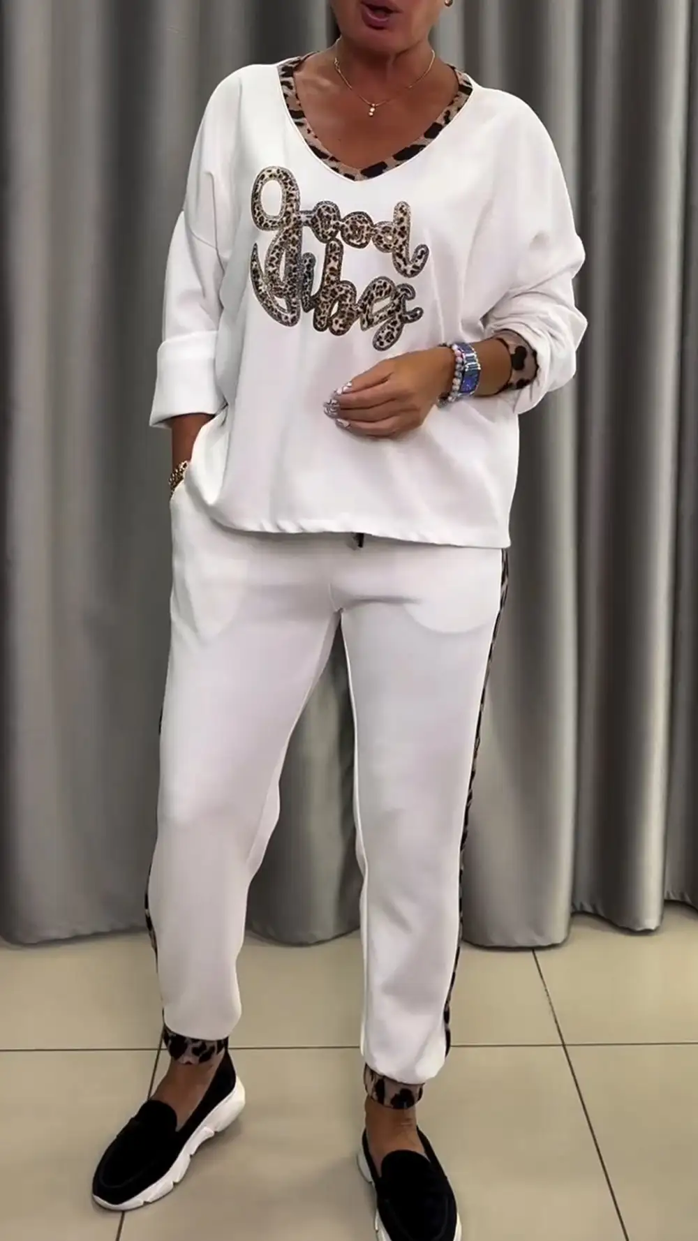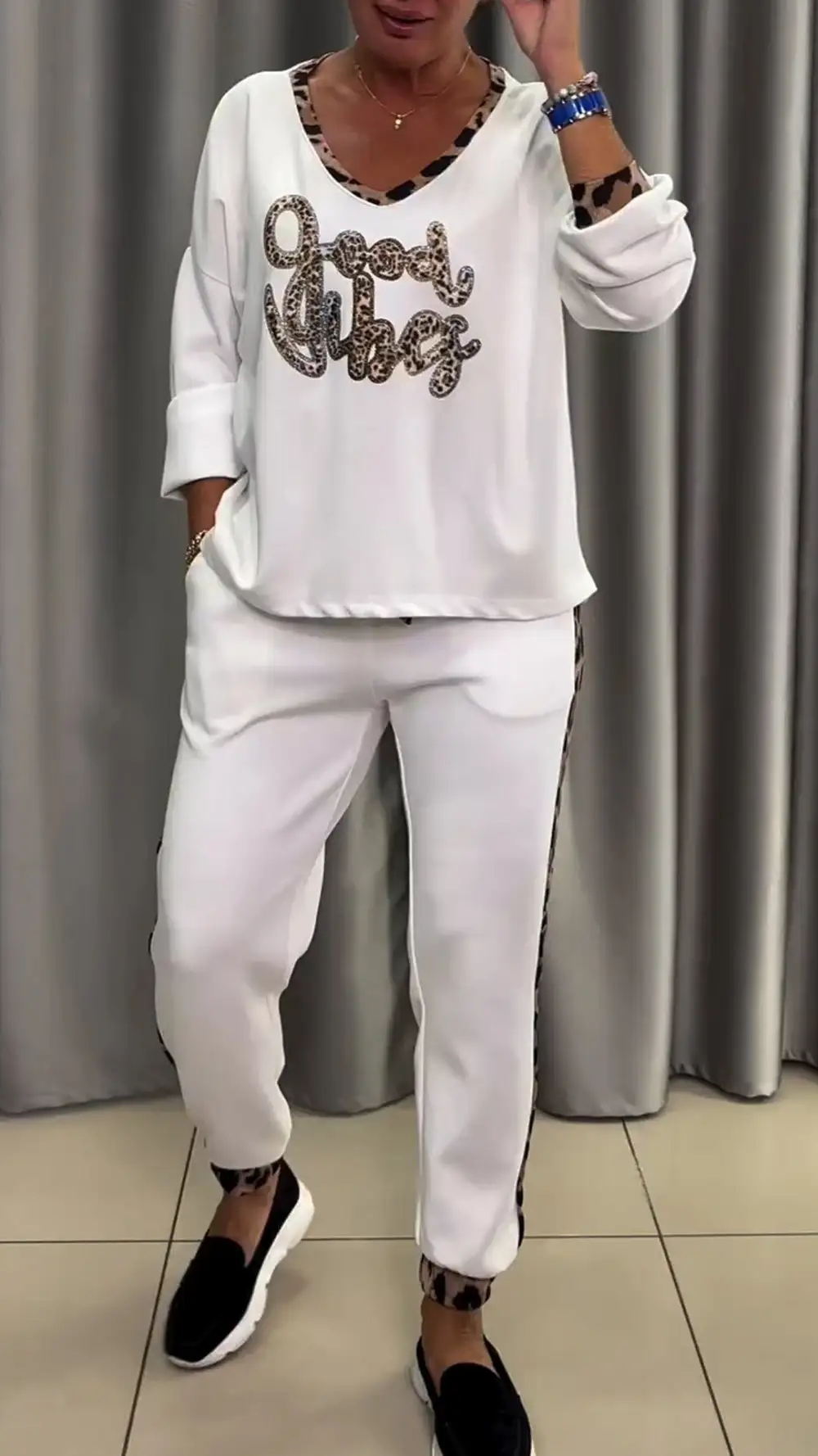Women's V-neck Long-sleeved Leopard Print Casual Suit